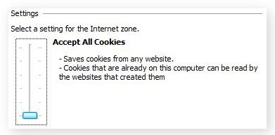 Go to Internet Options, click on the Privacy tab and note what level your setting is. Now move the slider down to Accept All Cookies and click OK.